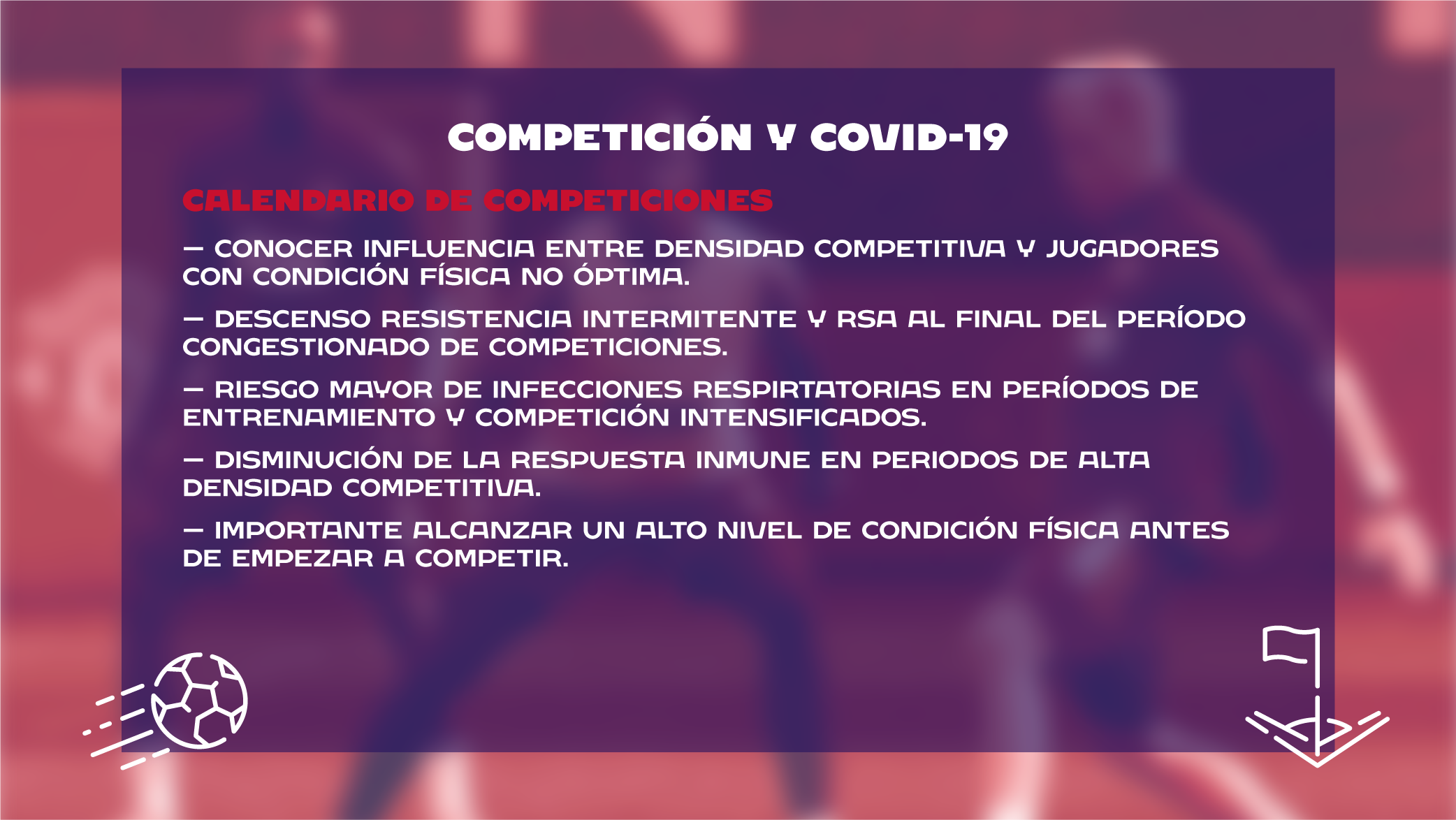 En otro apartado del artículo se trata la temática referente al calendario de competiciones. Tal y como solemos hacer en pretemporada, es importante alcanzar un alto nivel de condición física antes de empezar a competir. Pero ¿sinceramente tenemos ese tiempo ahora mismo con nuestros jugadores que salen de esta situación? ¿el calendario congestionado de competiciones nos ayuda a crear esta situación óptima de salud? Es claro y evidente que la influencia de la alta densidad competitiva en jugadores que no están en una condición física óptima es brutal. Además de la disminución de la respuesta inmune en jugadores que compiten cada 48/72 horas (Moreira et al., 2016; Mortatti et al., 2012), se suma el riesgo mayor de infecciones respiratorias en periodos de competición intensificados. Todo ello, además sumado a que, en dichos periodos de congestión en competición, necesariamente los entrenamientos tienen un efecto de mantenimiento más que de optimización del rendimiento.